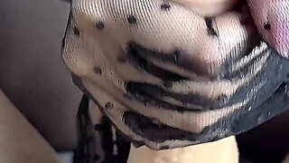 At a special location sexy brunette in fishnet stockings is giving a mesmerizing blowjob