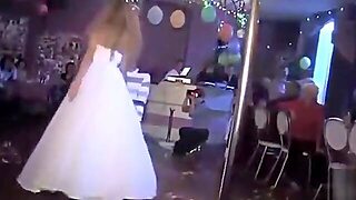 Foxy slim blonde performs a sensual striptease in a wedding dress