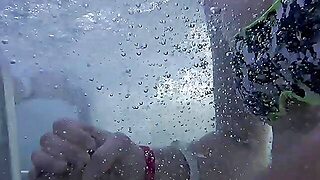 Hidden pool video: jet stream masturbation with water pressure and husband wants to help for underwater sex in public pool