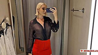 Trying on completely transparent clothes in the fitting room. Look at my boobs in a public place.