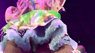 Racy blond dame in a spandex costume is performing on the stage, in front of many guys