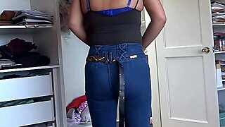 Exhibitionist milf teases in tight jeans, arousing cocks for anal pounding
