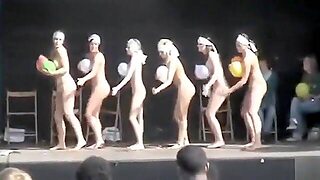 Naked ladies dance on stage with balloons