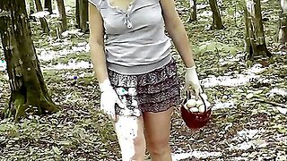 Sexy Milf without panties under skirt picks mushrooms in forest. Outdoor. Outside. No panties. In public. Outdoors. Ass. Pussy